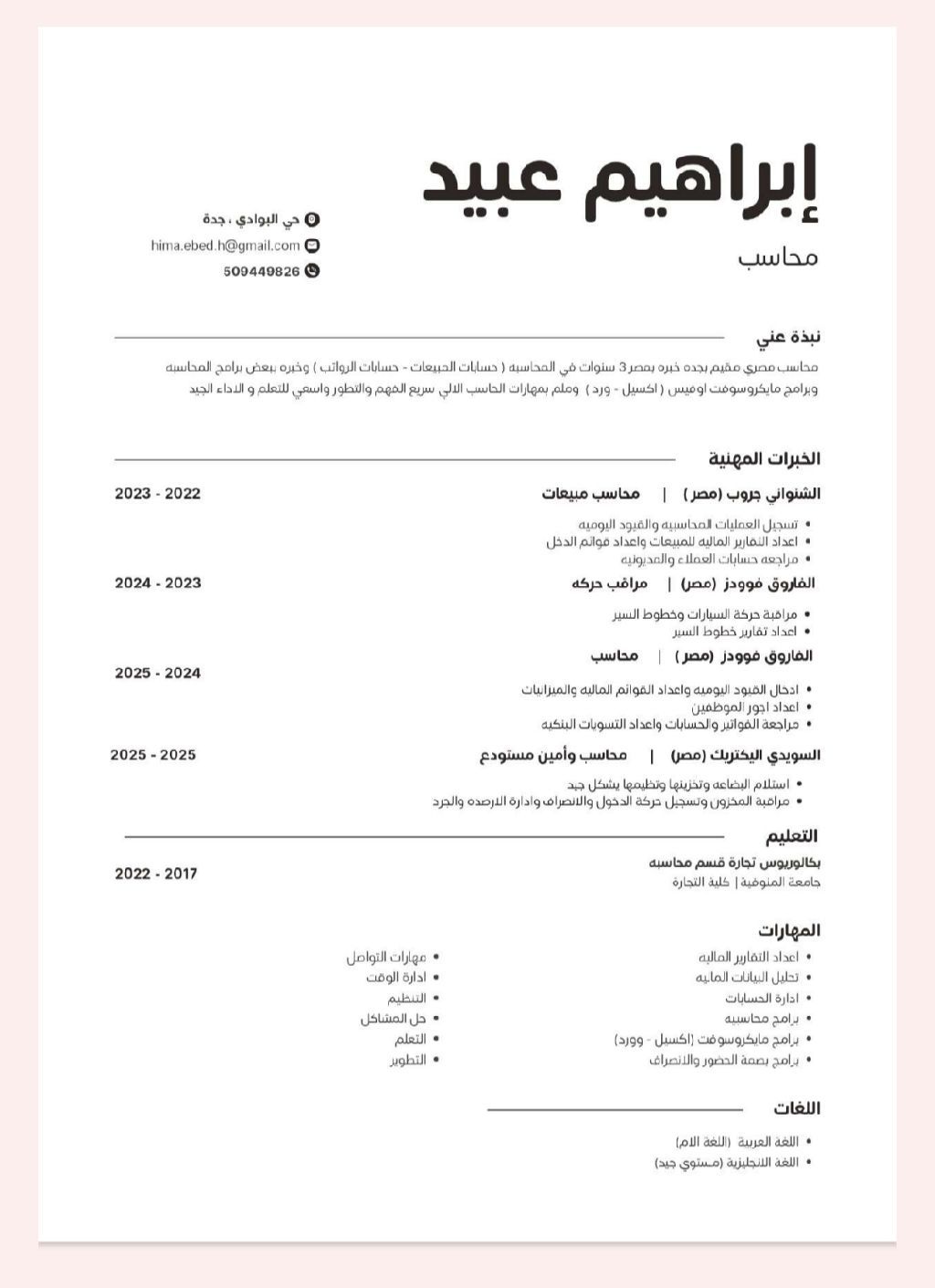 محاسب وأمين مستودع مصري خبرة سنتين في المحاسبه واعداد القوائم المالية والميزانيات وخبرة ببعض برامج المحاسبه وبرامج مايكروسوفت أوفيس (أكسيل - ورد) وملم بمهارات الحاسب الآلي وسريع الفهم والتطور واسعي للتعلم والأداء لجيد