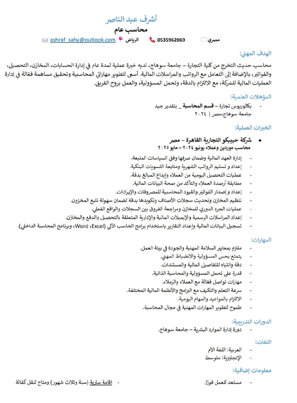 محاسب مصري حاصل على بكالوريوس تجارة - شعبة محاسبة (دفعة 2024) خبرة عملية أكثر من سنة في المحاسبة العامة. لدي خبرة في تسجيل القيود اليومية، متابعة الحسابات، المساعدة في اعداد التقارير المالية، والجرد والمخزون. أجيد التعامل مع برامج المحاسبة المختلفة وExcel، وأتميز بالدقة والتنظيم والالتزام بالعمل. متاح للعمل فورا - داخل الرياض أو أي مدينة أخرى