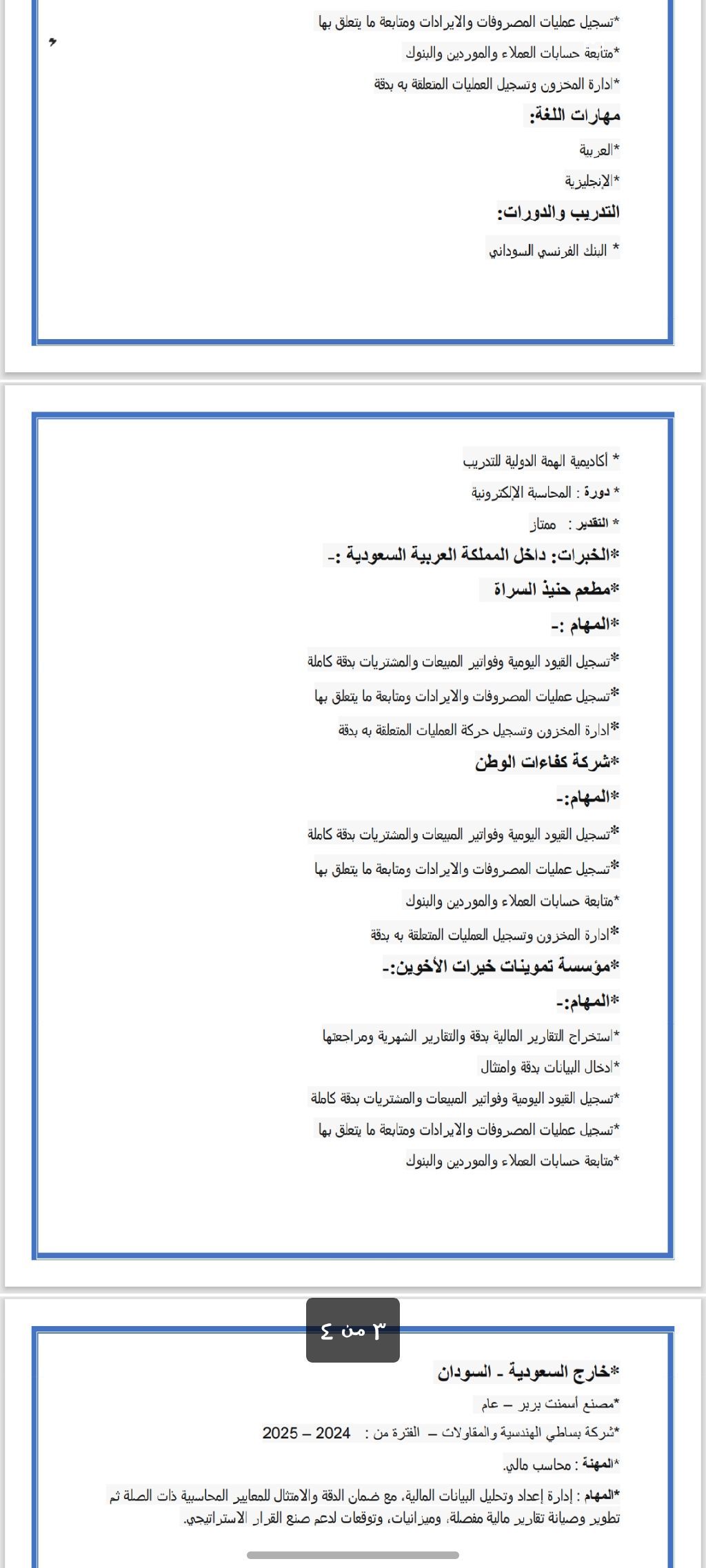 الاسم/ أب وبكر عبد المنعم حسن محمد العمر / 25 عام المؤهل العلمي / بكالوريوس الشرف في تخصص محاسبة التخصص / محاسبه المهنة / محاسب. الخبرات داخل السعودية شركة خيرات الوطن. مؤسسة خيرات الأخوين الخبرات خارج / شركة هندسية عام البنك الفرنسي السوداني. المهارات / أجيد وباحتراف استخدام الحاسب الآلي. مسخدم ممتاز لبرامج أل Microsoft Office. دورة تدريبية في تخصص. المحاسبة الالكترونية بتقدير ممتاز. متفرغ الآن