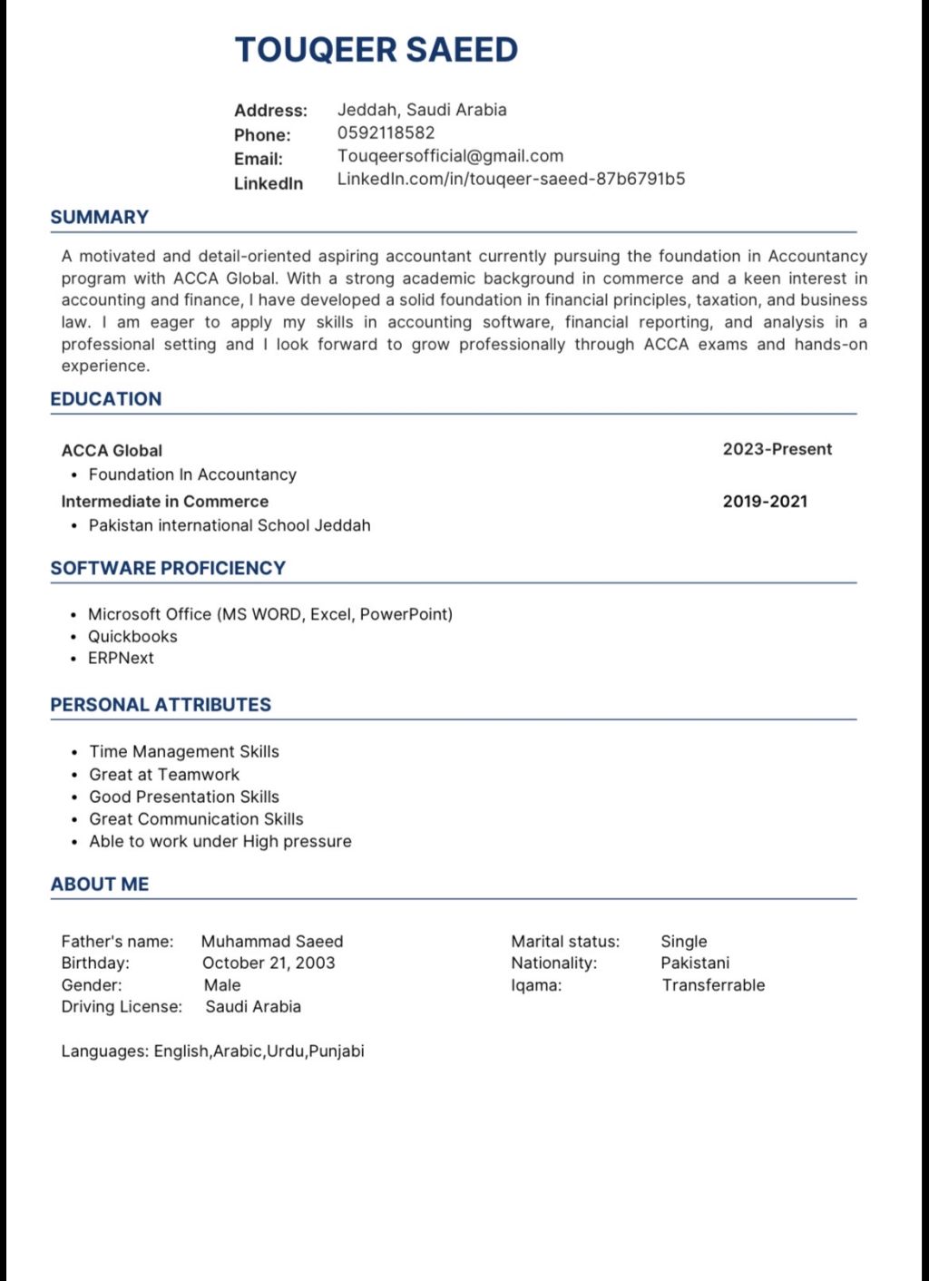 As an ACCA student nearing qualification, I bring a rigorous understanding of financial principles, from management accounting to audit and tax. I am a quick learner, highly adaptable, and possess a meticulous eye for detail. I am seeking an entry - level role where I can contribute actively, grow alongside your team, and develop into a valuable asset for your finance department