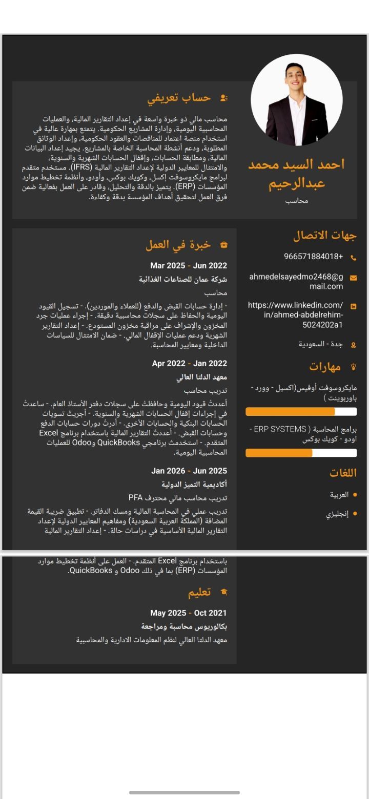ابحث عن وظيفة في الدمام أو الرياض (موجود في الدمام) عندي خبرة (ثلاث سنوات) في تسجيل القيود اليومية اعداد ميزان المراجعة اعداد القوائم المالية متابعة المخزون والموردين والعملاء وأعرف أتعامل مع ضريبة القيمة المضافة واعمل على Excel كويس وبعمل عليه نظام محاسبي كامل واشتغلت علي برامج محاسبية مثل Odoo وQuickbooks وبإذن الله بتعلم بسرعة لأن الأساس المحاسبي عندي قوي، وأي سيستم هو مجرد أداة تطبيق