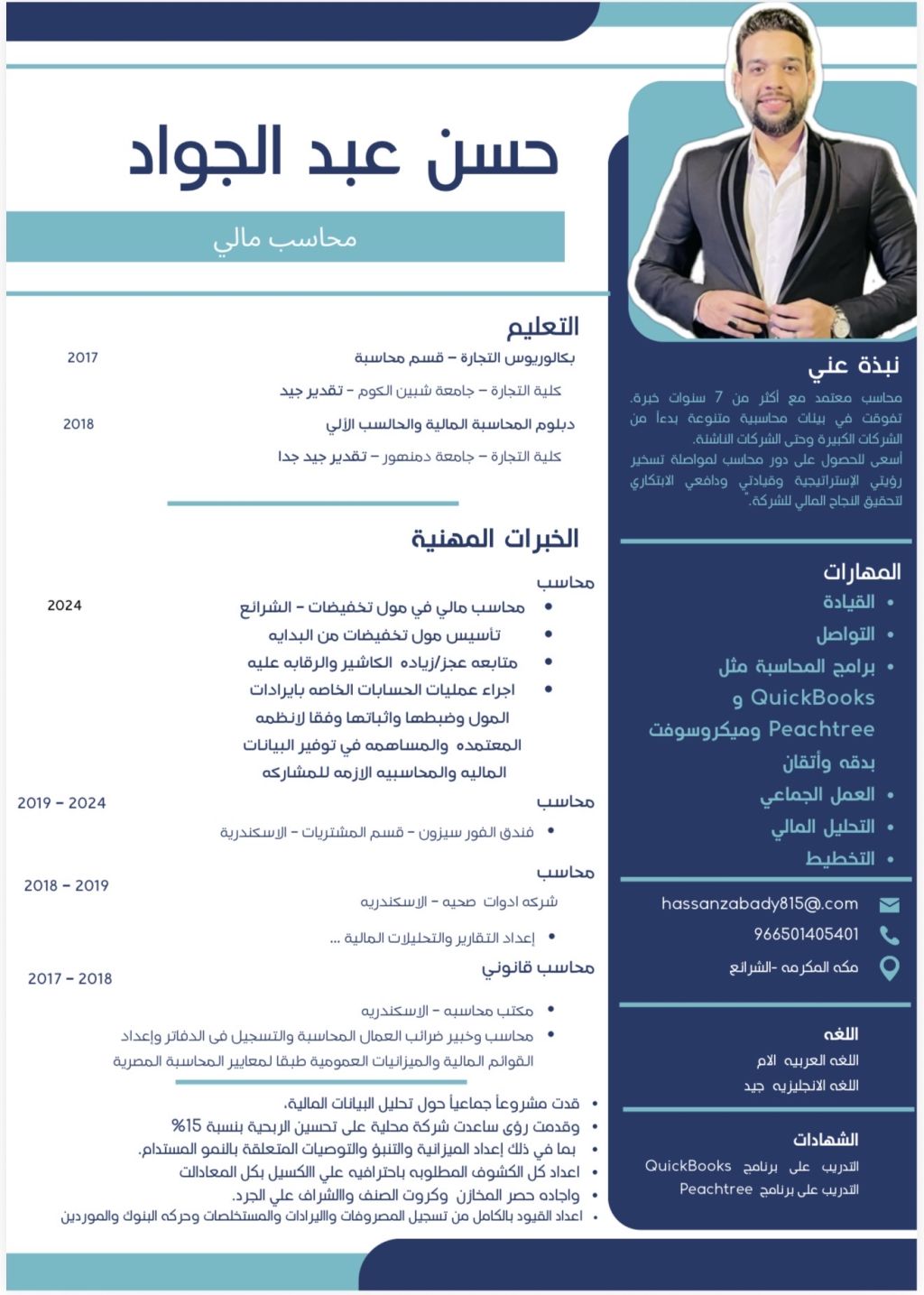 حاصل علي بكالوريوس تجارة قسم محاسبه وحاصل علي دبلومه محاسبه ماليه وحاسب آلي حيث أن لدي خبرة في مجال الحسابات لمدة 9 سنوات في مجال (مكتب محاسبه وضرايب & فنادق & شركات مقاولات) جيد في استخدام الاكسل باحتراف اضافة الى برامج محاسبه وخاصه عمل علي برنامج Quickbooks and Beachtree سني 30 سنة مقيم في مكة المكرمة آخر دوام حاليا في شركات مقاولات خاصه بالحج والعمره رقم اتصال رقم