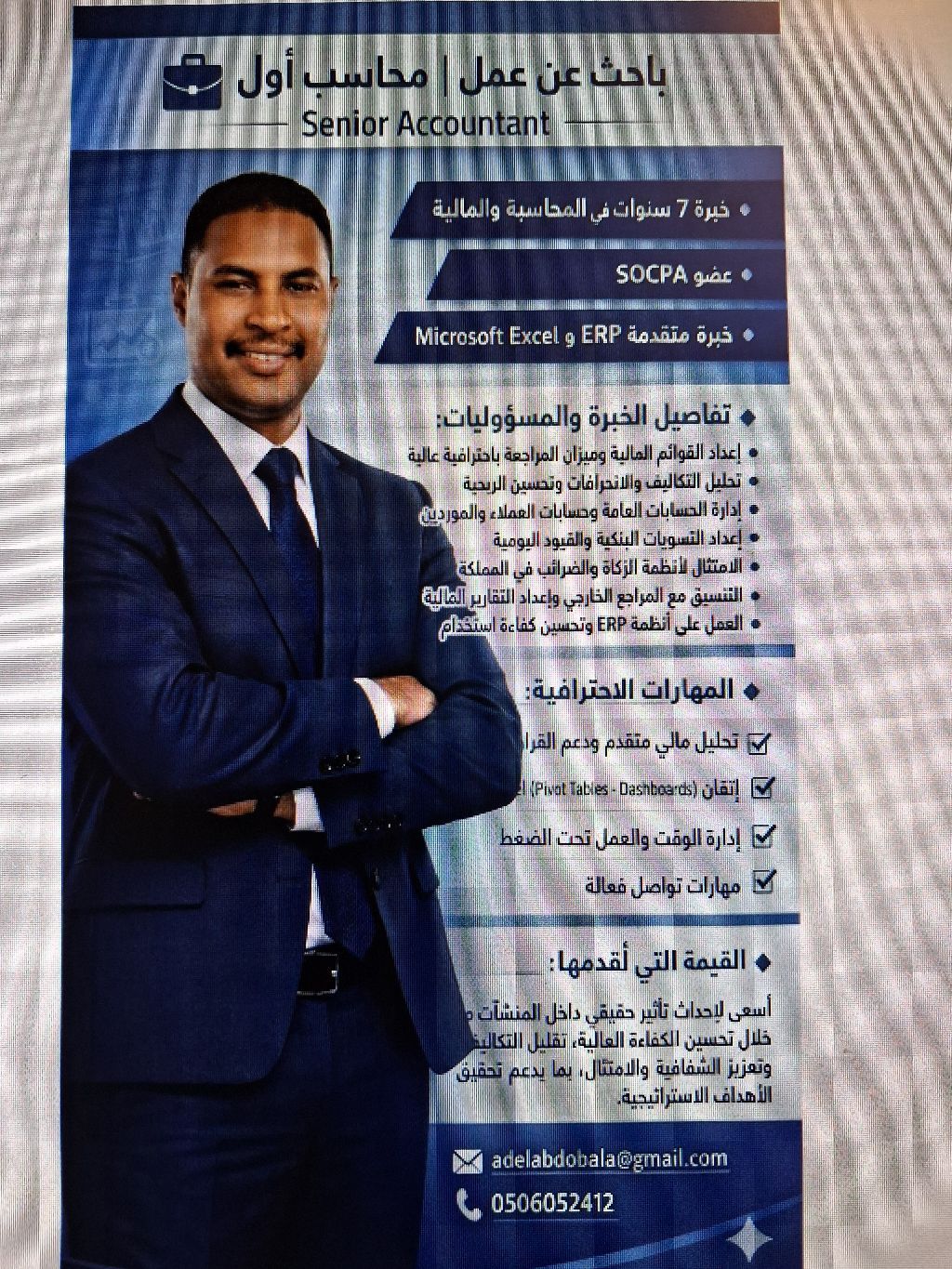 محاسب أول خبرة 6 سنوات في المحاسبة والدورة المحاسبية، والفوترة، قيود اليومية، التسويات البنكية، الرواتب، وتصفية العهد، مراقبة التكاليف متابعة الموردين، والعملاء اعداد وتقديم الاقرارات الضربية والزكوية في المواعيد المحددة والتأكد من مطابقتها للأنظمة، أقفال الحسابات الشهري، اعداد القوائم المالية طبقا للمعايير، والتعامل مع مكاتب المراجعة وتبسيط العمليات باستخدام برامج ERP وبرامج Microsoft Eexel