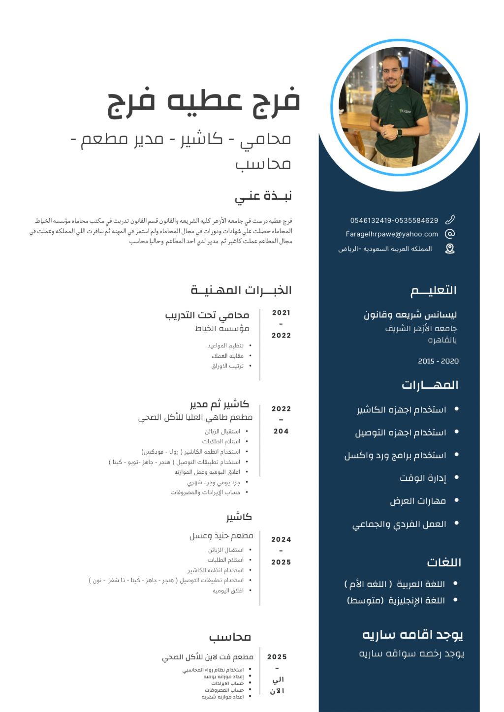 أنا مقيم في الرياض ابحث عن عمل يفضل يكون في مكة أو المدينة أجيد التعامل مع أنظمة الكاشير (رواء - فوديكس) وأجيد التعامل مع تطبيقات التوصيل اشتغلت في عدة مطاعم وحاليا اشتغل محاسب في مطعم صحي (مسؤول عن الحسابات في كل الفروع)