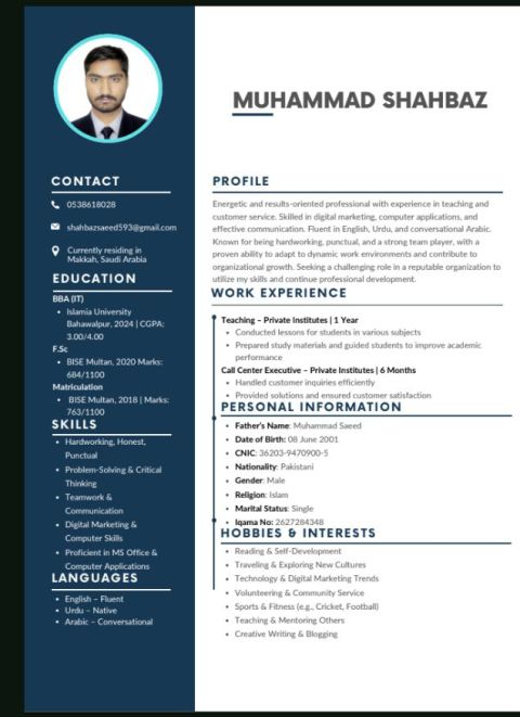 I am a Certified Public Accountant (CPA) Chartered Accountant (CA) Finalist, and a Bachelor's graduate currently seeking accounting opportunities in Saudi Arabia (KSA) with a transferable Iqama. I have 6 years of diversified experience in accounting and auditing across Pakistan and KSA. Expert in ERP systems, VAT/ ZATCA compliance, and Advanced Excel. Contact Information