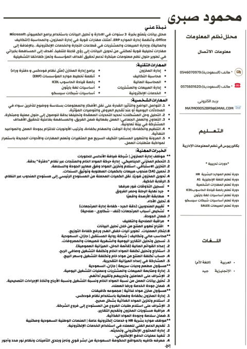 أنا شاب مصري طموح ابحث عن فرصة عمل تناسب خبرتي في المحاسبة المالية وإدارة التكاليف تحليل البيانات لتحسين الربحية ومراقبة التدفقات وإدارة المخزون وتنظيم الجرد وموظف موارد بشرية والخدمات العامة في كل ما يخص مسير الرواتب وانشاء عقود العمل الخ. أتميز بالدقة والالتزام بالمواعيد وقدرة على العمل الجماعي مع حرصي على تطوير مهاراتي باستمرار أطمح بيئة عمل حضارية تسعيللتطويرالنمو