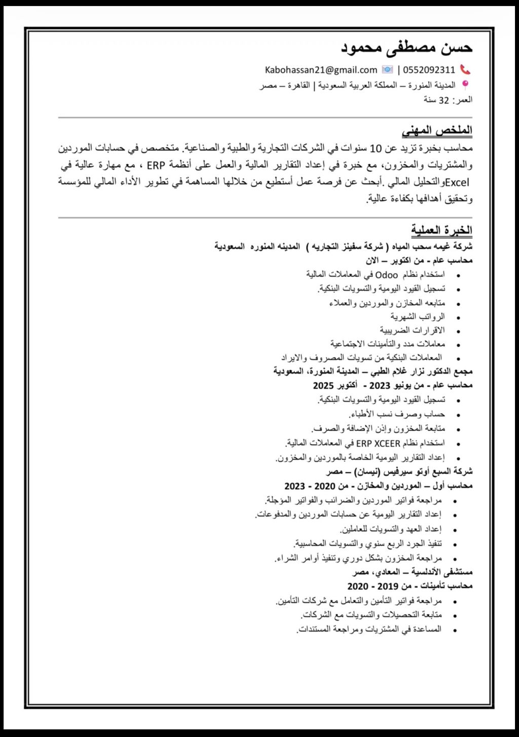 محاسب ورائيس حسابات ابحث عن عمل خبرة 10 سنوات في الشركات التجارية والصناعية والطبية، ومتقن للعمل على أنظمة أل Odoo ERP واعداد التقارير المالية والتقفيل الضريبي بدقة عالية. أقدم خدمات المحاسبة والاشراف المالي بدوام جزئي أو عن بعد، مراجعة وتقييد العمليات المحاسبية - التقفيل الضريبي واعداد الاقرارات - متابعة الحسابات والموردين والعملاء