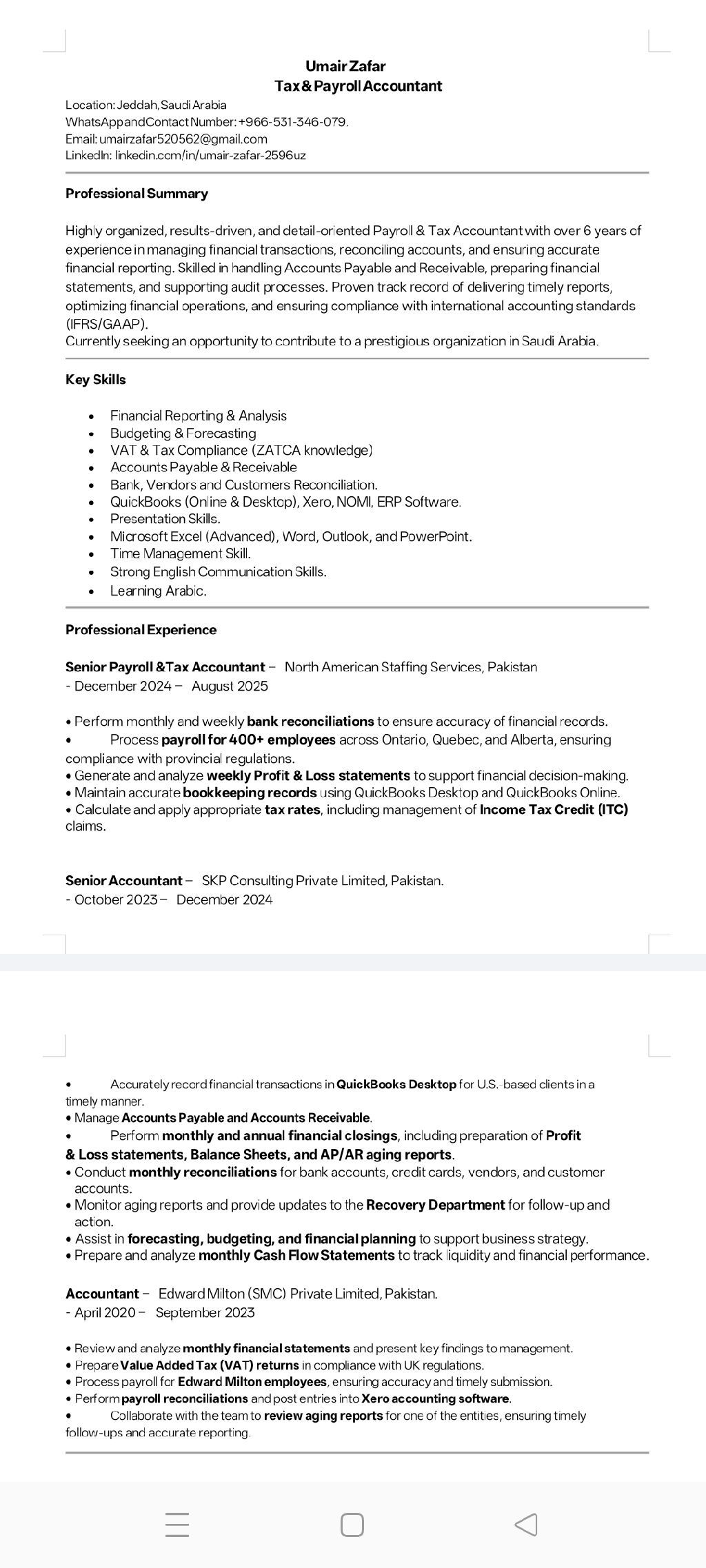 My name is Umair Zafar and I am a highly skilled and motivated professional with over 7 years of experience in US & Canada Based and UK based Organizations. My background includes handling Bank Reconciliation Receivables, monthly Payables, Receivable and Budgeting. I am looking for the role of an Accountant, Financial Analyst, Book keeper, Tax Advisor. With a Masters degree in Accounts & Finance