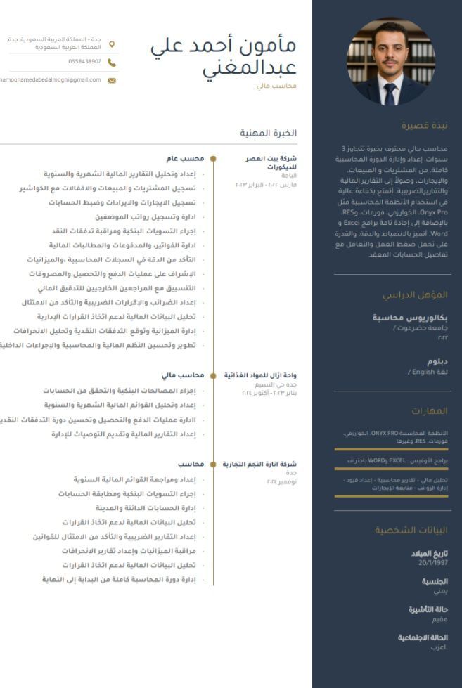 محاسب متمكن بخبرة 3 سنوات في المملكة بكالوريوس في اعداد القوائم المالية، المبيعات والمشتريات، تقفيل الكاشير، الرواتب، الإيجارات والمقدمات، والمطابقات البنكية. متمكن من أنظمة Onyx Pro وExcel، وخبرة في الأنظمة السعودية تجديد الاقامات، نقل الكفالات، السعودة، حماية الأجور، ومنصة مدد. جدة بكالوريوس محاسبة