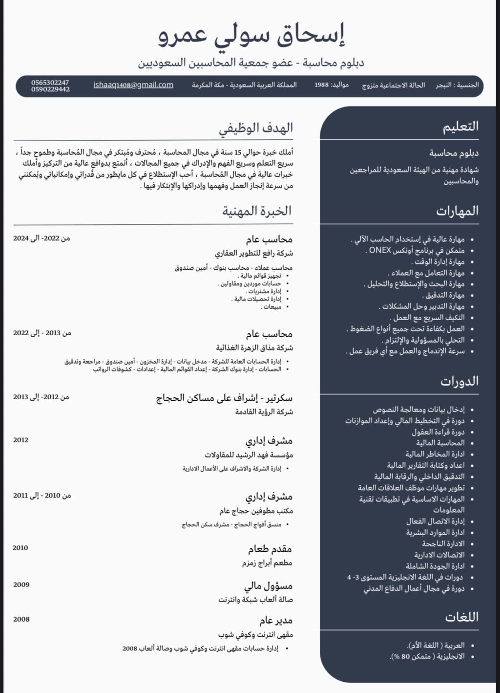 محاسب ذو خبرة عالية في تخصصي، سبق لي العمل في المراجعة والتدقيق وإدارة المخزون والتعامل مع البنوك والصندوق وإدارة حسابات المقاولين والمشتريات والتحصيلات المالية وأمين صندوق والمبيعات ومحاسب عملاء