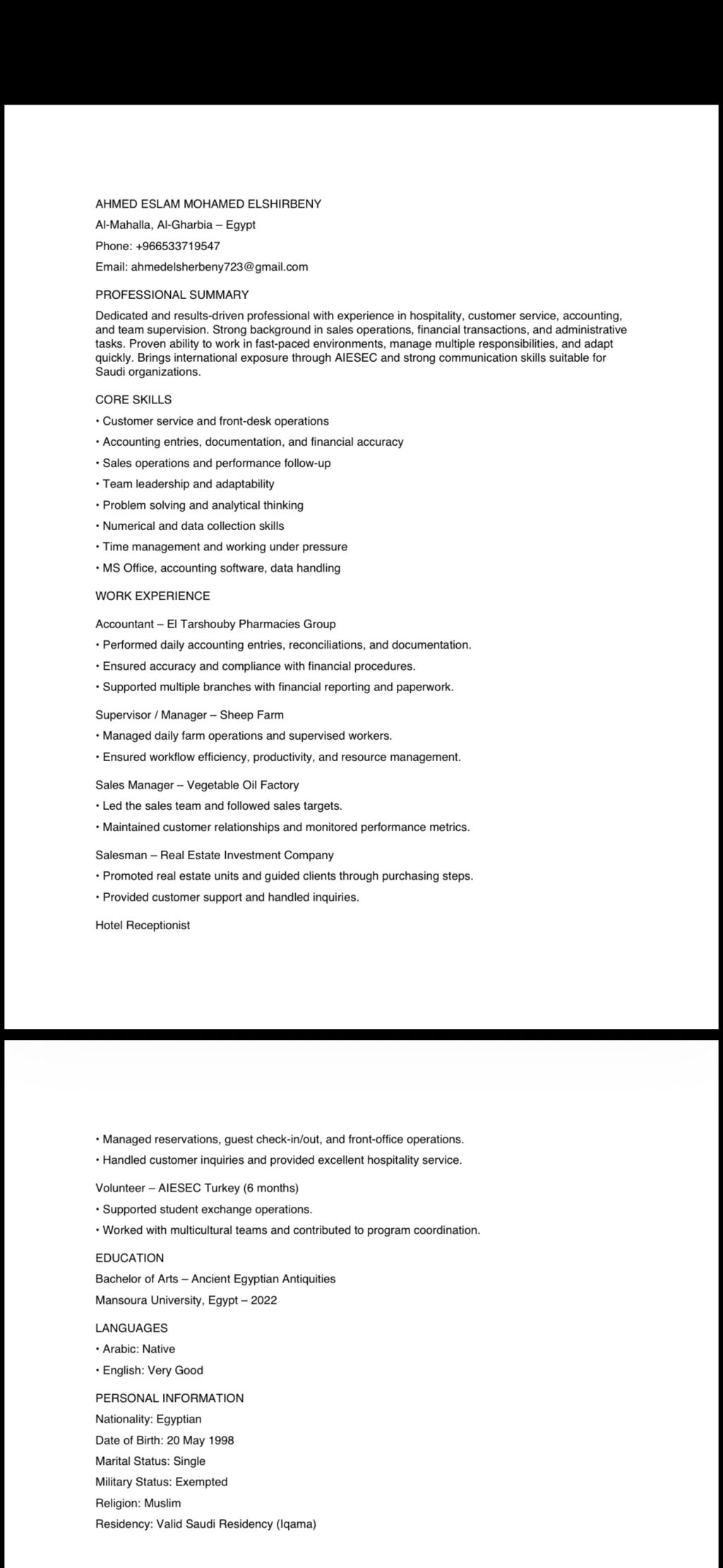 خبرة سنتين كاشير ومحاسب. أيضا في السليز والعمل الاداري برجاء التواصل في حالة وجود أي فرصه مرفق مع الاعلان CV الخاص بي