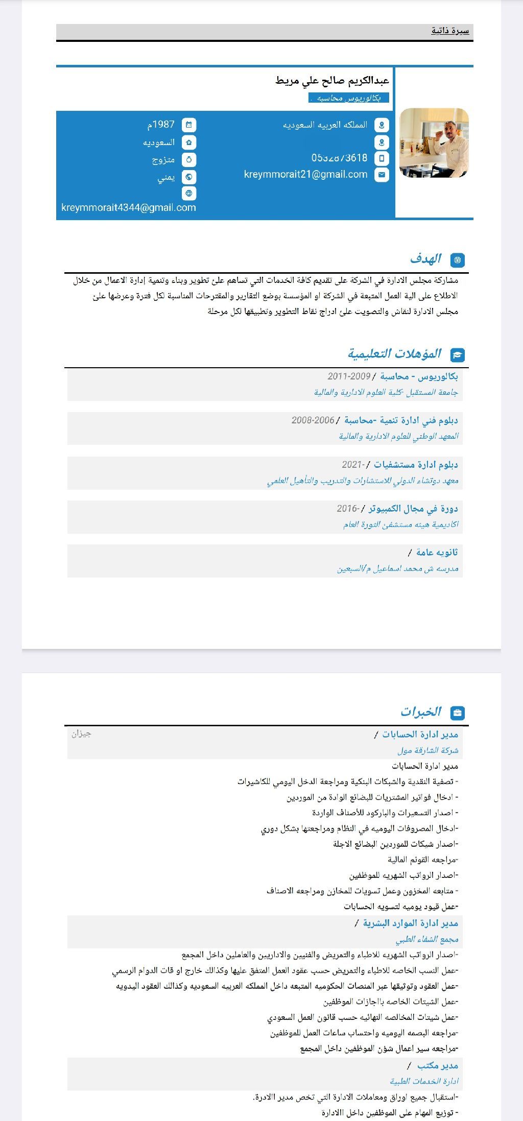 محاسب بكالوريوس خبرة عمل 5 سنوات داخل المملكة عملت في عدة أنشطة متاح حاليا