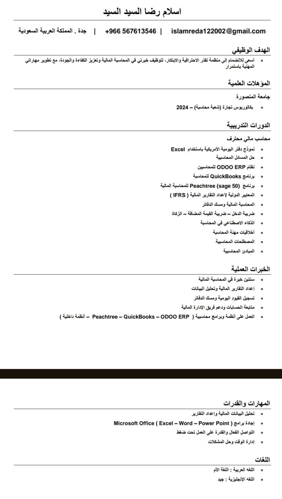 Recent Graduate Financial Accountant based in Jeddah seeking a job opportunity in Saudi Arabia. Skilled in journal entries, bank reconciliations, accounts receivable and payable, and financial reporting. Proficient in Excel, Quickbooks, Odoo, Sage 50, detail - oriented, organized, and a team player. Available immediately. Contact