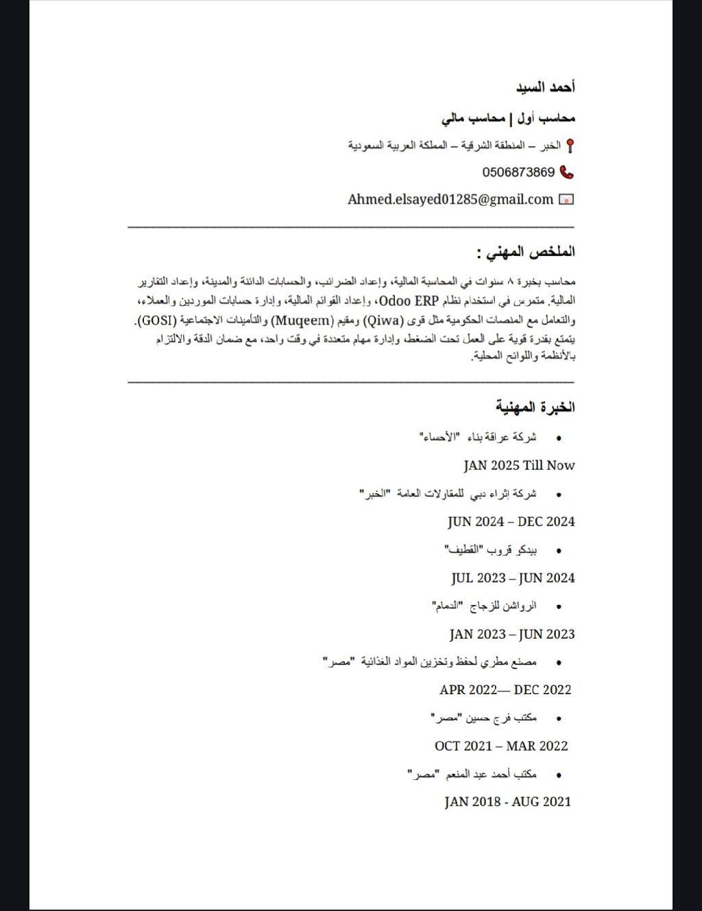 محاسب أول بخبرة 8 سنوات في نشاط المقاولات. أقدم ضبطا للدورة المالية والسيولة (رواتب / موردين / مقاولين) مع تقارير وقوائم مالية دقيقة. خبرة في VAT، متابعة العملاء والموردين (AR / AP) والمطابقات البنكية. أتابع تكلفة وربحية المشاريع وأنظم دورة المشتريات والتنسيق المالي للتوريد لضمان سلاسة التنفيذ. متمكن من Odoo ERP وExcel (Pivot/ Dashboards)