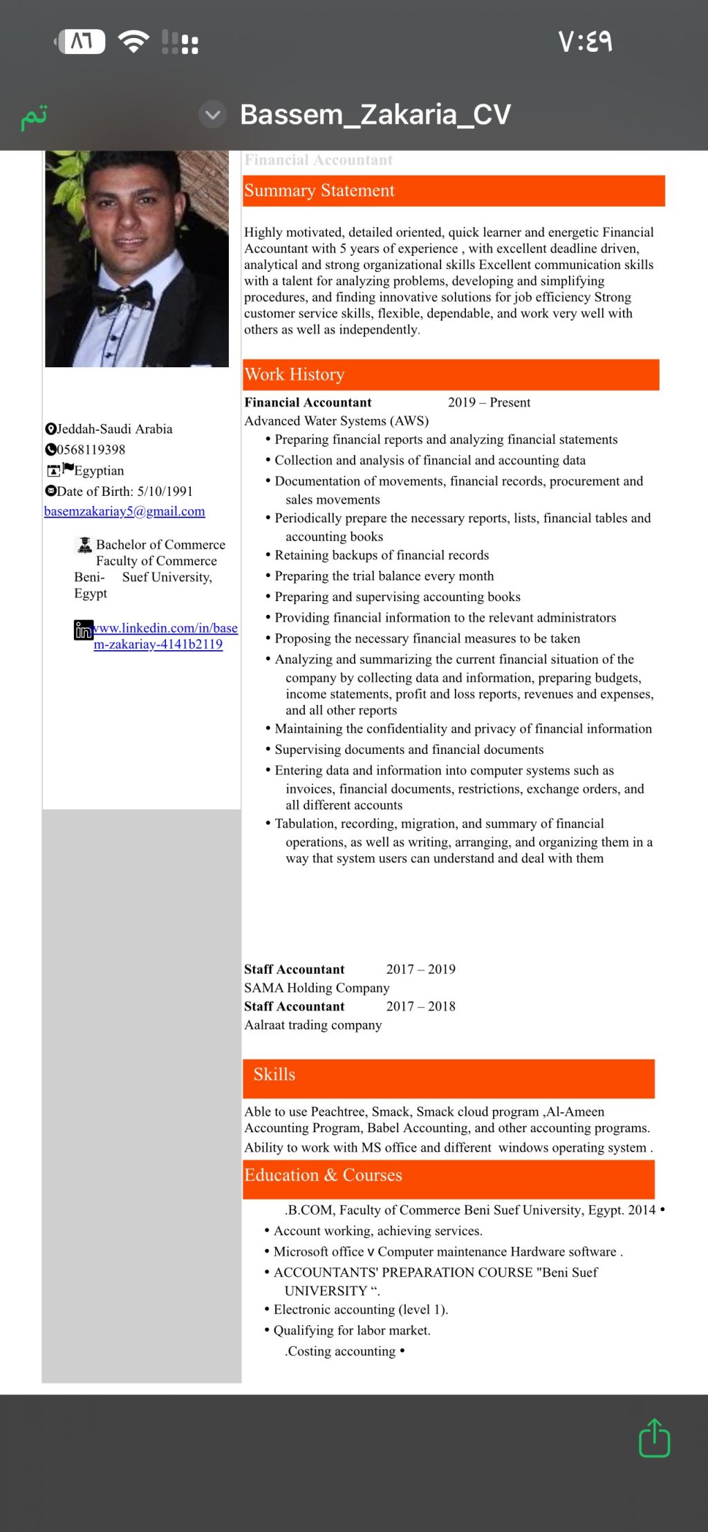 أطلب عمل محاسب مصري خبرة 10 سنين داخل المملكة في الشركات التجاريه العمل علي البرامج المحاسبية واعداد التقارير الشهريه والسنويه واعداد ضريبة القيمة المضافة والزكاء وأقفال الميزانيات والعمل علي المنصات الحكوميه الاستعداد علي العمل في أي مكان داخل السعودية