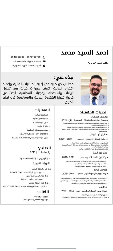 A chief accountant Egyptian with over 15 years of experience in preparing, reviewing, and managing accounts, zakat, taxes, and preparing financial reports for several businesses in Saudi Arabia