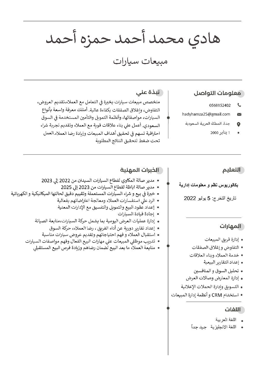 خبرة ممتازة في مبيعات السيارات والتأجير لدي القدرة علي فحص وتقييم حالة السيارات المستعملة ابحث عن فرصة عمل في صالة سيارات لدي القدرة علي العمل تحت ضغط