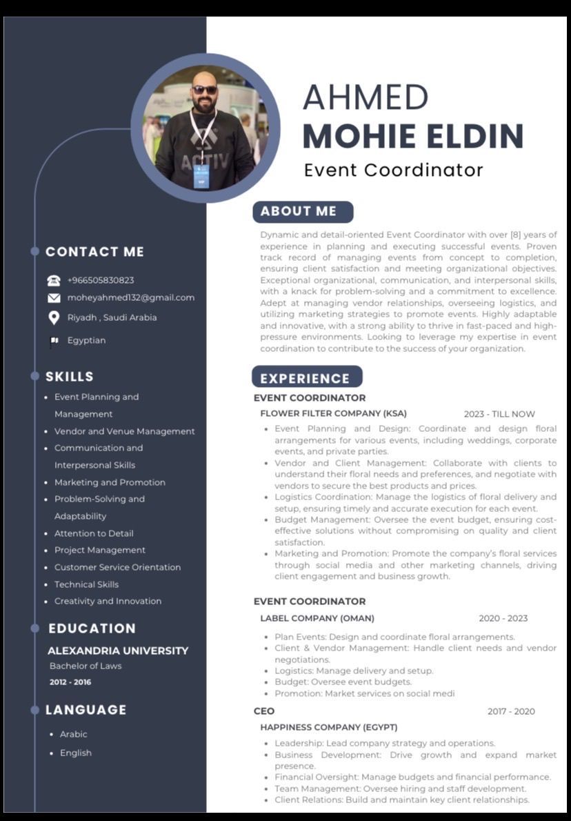 ابحث عن فرصة عمل كمنسق حفلات بخبرة 10 سنوات في عالم الجمال وتنظيم المناسبات. أتميز بخبرة واسعة في تنسيق الورد بجميع أنواعه وتصميم البوكيهات بطريقة احترافية. تنسيق كوش الأفراح والديكورات الداخلية والخارجية بأفكار مبتكرة تناسب جميع الأذواق. إدارة الحفلات والمناسبات من الفكرة حتى التنفيذ بدقة عالية. لمسات فنية خاصة تضمن جمال المكان وروعة الأجواء. التزام، احترافية، ودقة في المواعيد