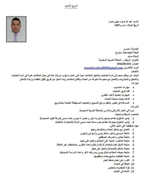 الاسم عبد الله مدير تشغيل الخبرات والمهارات خبرة واسعة في إدارة فرق العمل وتنظيم سير العمليات اليومية. قدرة عالية على رفع مستوى الخدمة وتحقيق رضا العملاء. إدارة المشتريات والمخزون ومراقبة الجودة. وضع الخطط التسويقية وتحقيق الأهداف التشغيلية خبرة 12 عاما في مجال المطاعم داخل المملكة مدير تشغيل مطاعم مونجو وشاورما ستور وعصير ذا جوسر تحت مسمى (شركة أطيب المحدودة 2 مدير تشغيل مجموعة مطاعم جارم مسا لا