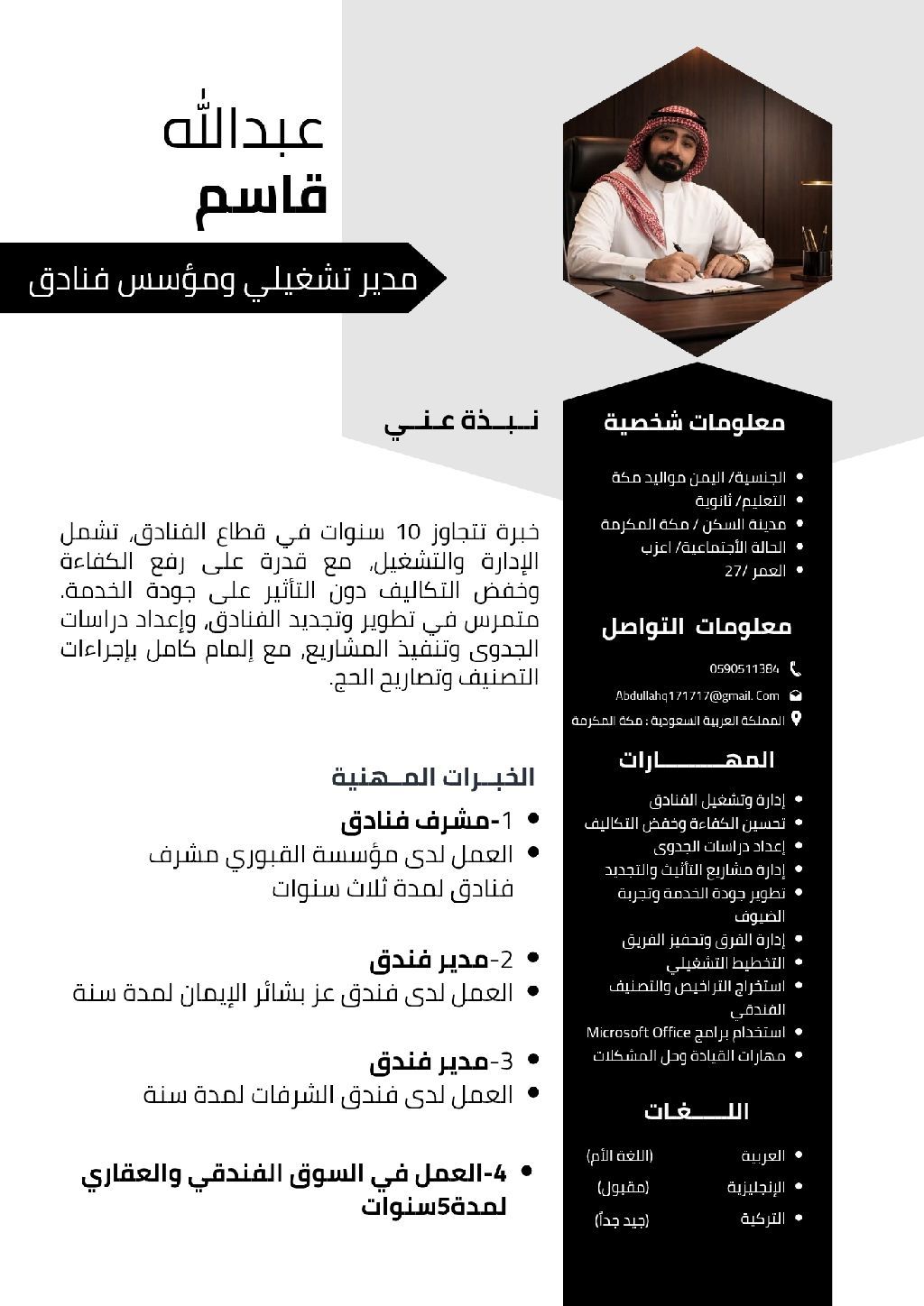 خبرة تتجاوز 10 سنوات في قطاع الفنادق، تشمل الإدارة والتشغيل، مع قدرة على رفع الكفاءة وخفض التكاليف دون التأثير على جودة الخدمة. متمرس في تطوير وتجديد الفنادق، واعداد دراسات الجدوى وتنفيذ المشاريع مع المام كامل باجراءات التصنيف وتصاريح الحج