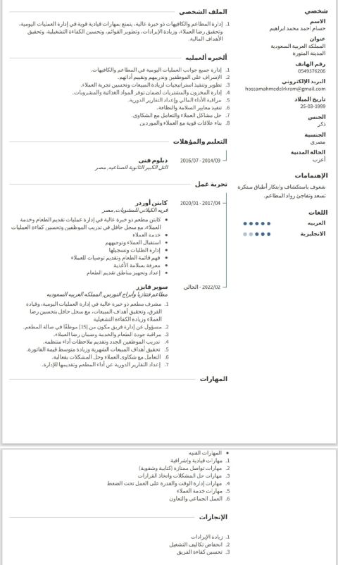 مدير تشغيل / مدير المقاهي والمطعم. لدي خبرة تزيد عن 8 سنوات في إدارة الأغذية والمشروبات، بما في ذلك التأسيس والتشغيل. تشمل مهاراتي مراجعة الانتاج والجودة، وتدريب الموظفين، وانشاء هيكل اداري فعال للمشتريات والمخزون، واعداد تقارير المبيعات والمصروفات اليومية والأسبوعية. أجيد المحاسبة. لدي اقامة سارية لمدة 11 شهر يوجد سيارة خاصة