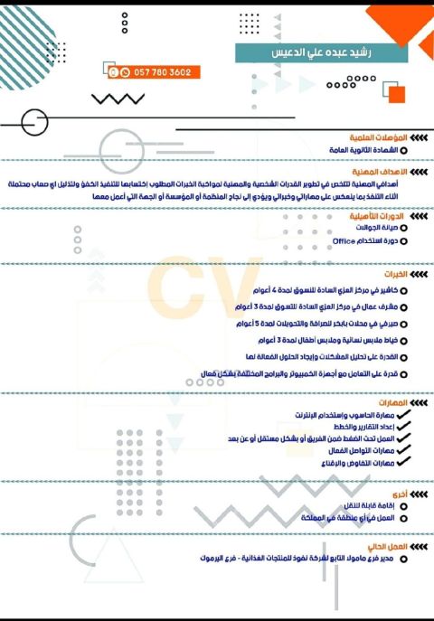 الاسم رشيد عبده على الدعيس يمني شهادة الثانوية شهادة في صيانة الجوالات دوره في خياطة الفساتين النسائيه والاطفال الخبرات العملية كاشير في مركز السادة لمدة 4 أعوام مشرف عمال في مركز السادة 3 أعوام صيرفي في محلات بابكر للصرافة والتحويلات 5 أعوام (مشرف فرع مأمولا اليرموك) الرياض. التابع لشركة نفوذ المهارات ابتكار الخطط لتطوير العمل التركيز في العمل تحقيق الأهداف