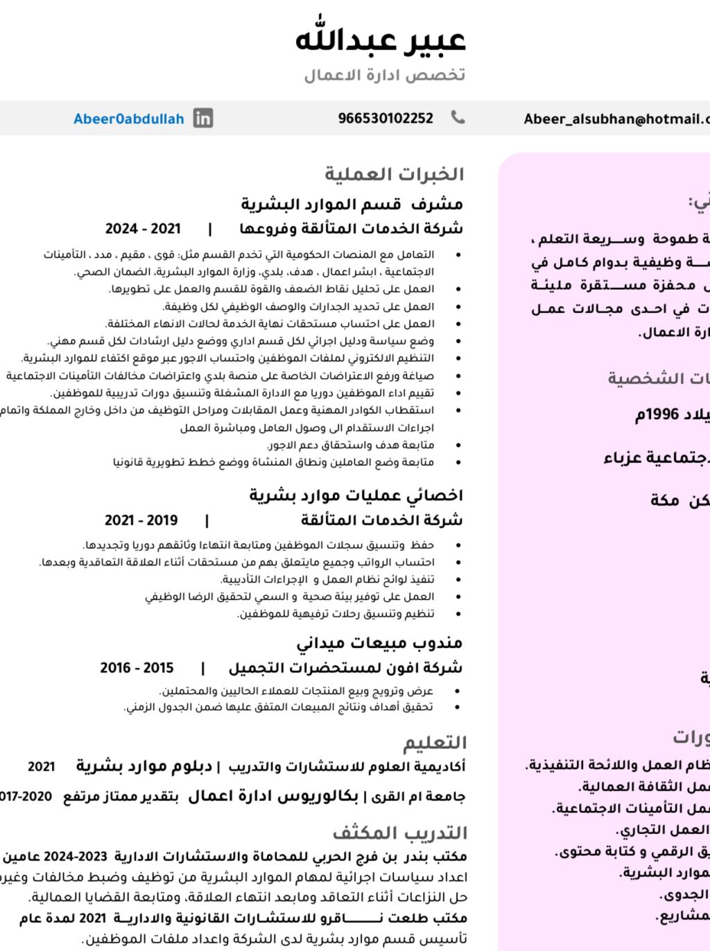 ابحث عن عمل (موارد بشرية أو مساعد اداري) في مكة لدي خبرة 5 سنوات موارد بشرية، خريجة بكالوريوس ادارة أعمال ولدي دبلوم موارد بشرية