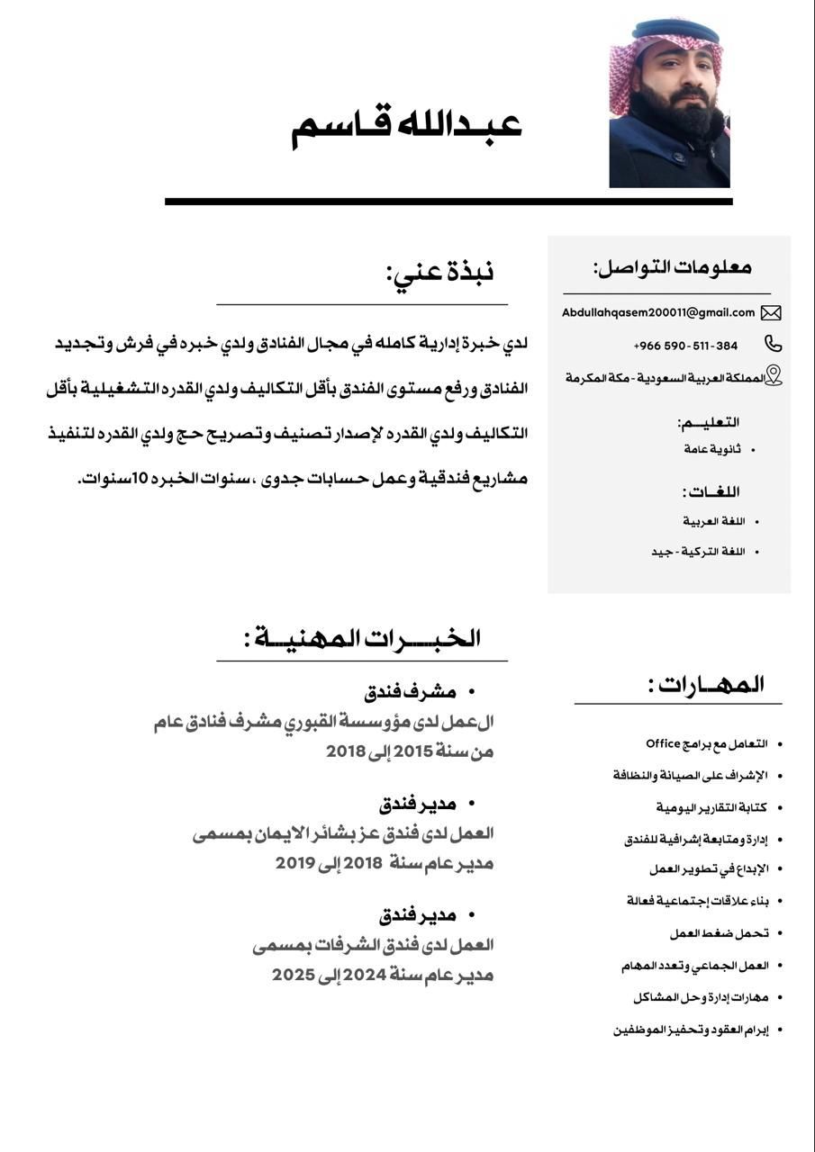 امتلك خبرة تمتد لأكثر من 10 سنوات في قطاع الفنادق، منها 5 سنوات في إدارة وتشغيل الفنادق، شملت العمل كمشرف فندق لمدة 3 سنوات، ثم كمدير لمدة عامين، و5 سنوات في سوق الفنادق. لدي خبرة شاملة في الإدارة التشغيلية للفنادق، مع قدرة متميزة على رفع كفاءة التشغيل وتقليل التكاليف دون التأثير على جودة الخدمة. كما أتمتع بخبرة واسعة في تأثيث وتجديد الفنادق وتطوير مستوى الأداء العام بأقل التكاليف