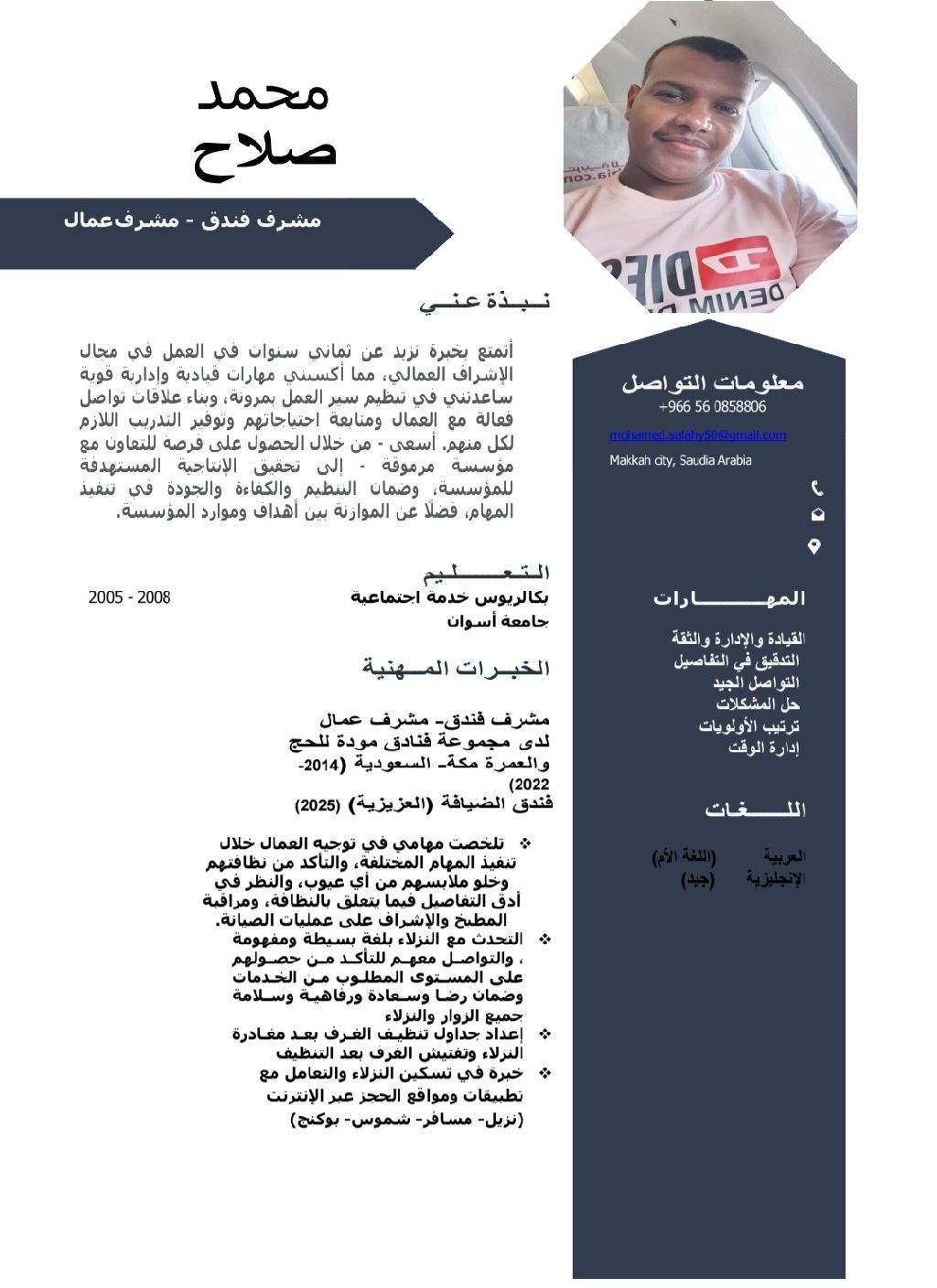 الاسم/ محمد صلاح الدين محمد الجنسية مصري السن / 35 سنة حاصل علي بكالوريوس خدمة اجتماعية عالي أجيد اللغة الانجليزية ابحث عن وظيفة في مجال الفنادق مشرف أو اشراف داخلي خبرة في المجال 7 سنوات اشتغلت في مكة في مجال الفنادق من 2014 الى 2022 أجيد برنامج نزيل للتسكين وبرنامج الحجوزات بوكينج والمسافر وكل برامج الحجز أون لاين