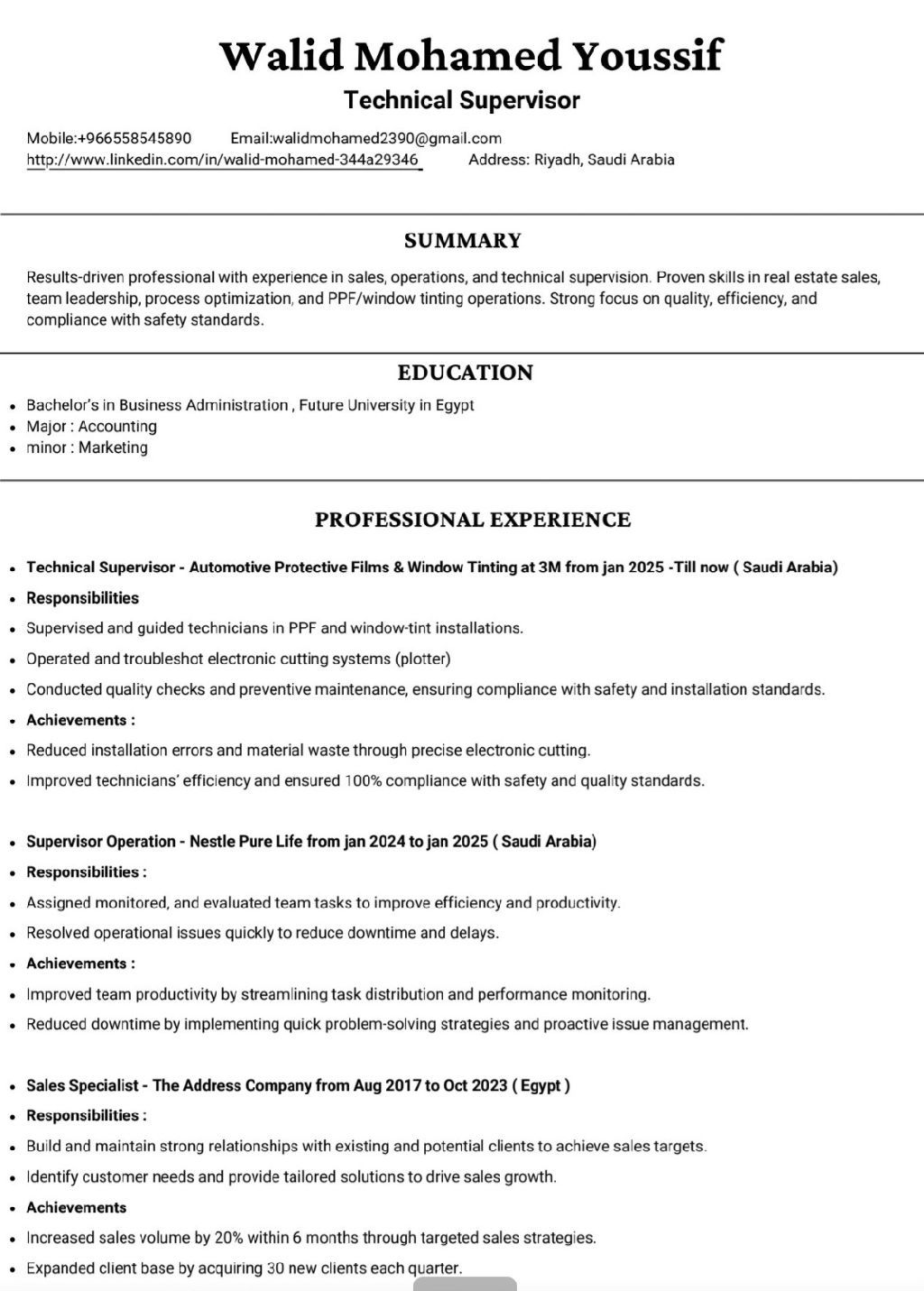 مدير تشغيل وفنيين، ابحث عن وظيفة أخرى. حاصل على ماجستير في ادارة الأعمال'خبرة 3 سنوات لدى شركة نستله بيور لايف وشركة 3M الأمريكية