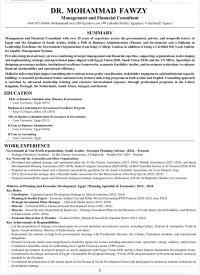 Strategic Planning Expert, Feasibility Studies and Business Valuation Specialist, Certified Trainer, and University Lecturer in Business Administration. Experienced across government, private, and nonprofit sectors in Egypt and Saudi Arabia. Holds a PhD in Business Administration with nearly 20 years of experience. Available for work in Riyadh or Al Qassim