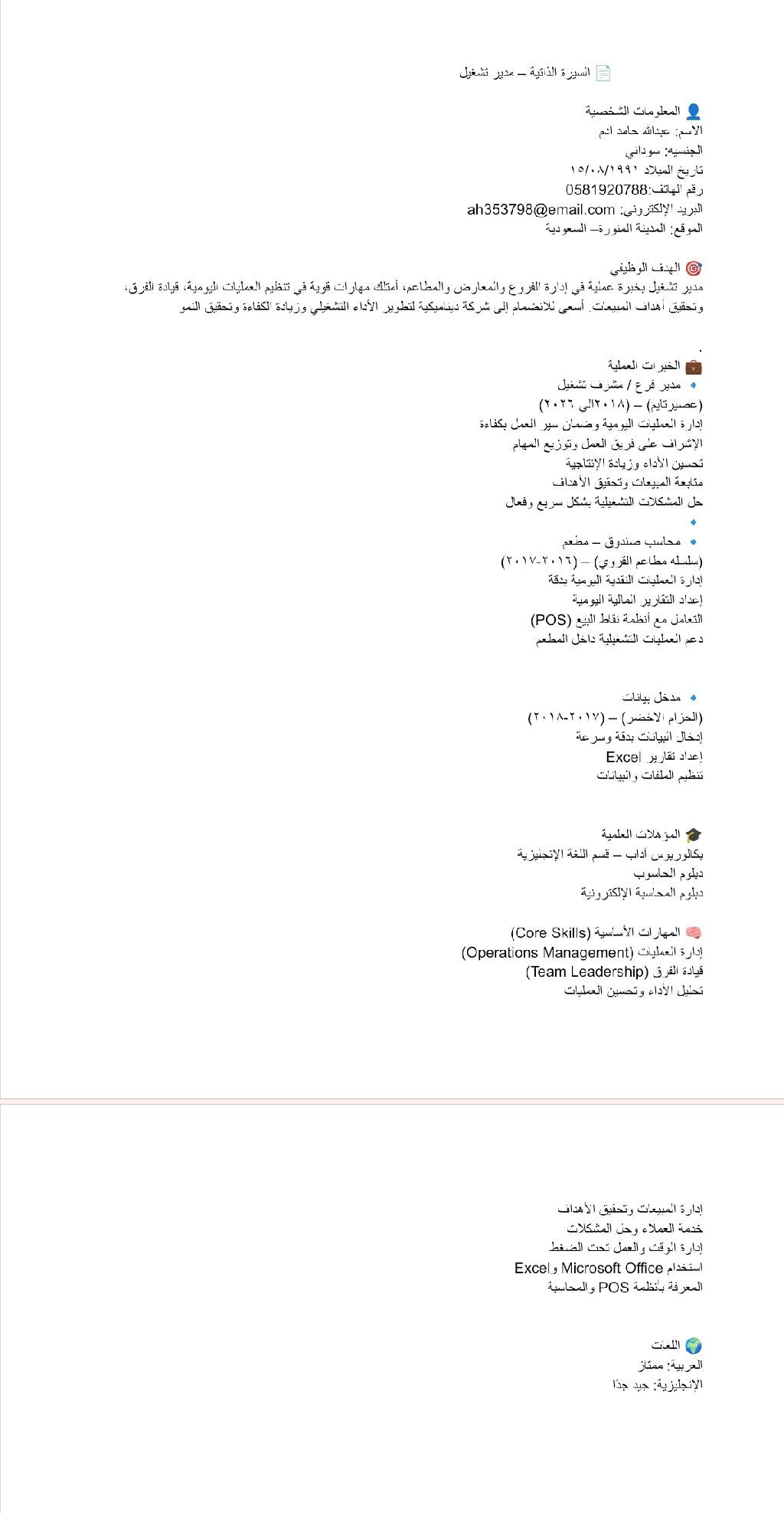 ابحث عن فرصة عمل - مجال المطاعم والكافيهات لدي خبرة عملية قوية في إدارة وتشغيل المطاعم والكافيهات، بالاضافة الى خبرتي في الاشراف وإدارة الفرق. عملت كمدير فرع ومشرف تشغيل خبرة في إدارة العمليات اليومية داخل المطاعم عملت كمحاسب صندوق (كاشير) ولدي معرفة بأنظمة POS خبرة في خدمة العملاء وتحسين تجربة الزبائن القدرة على إدارة الفريق وتحقيق أهداف المبيعات