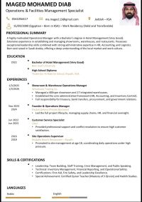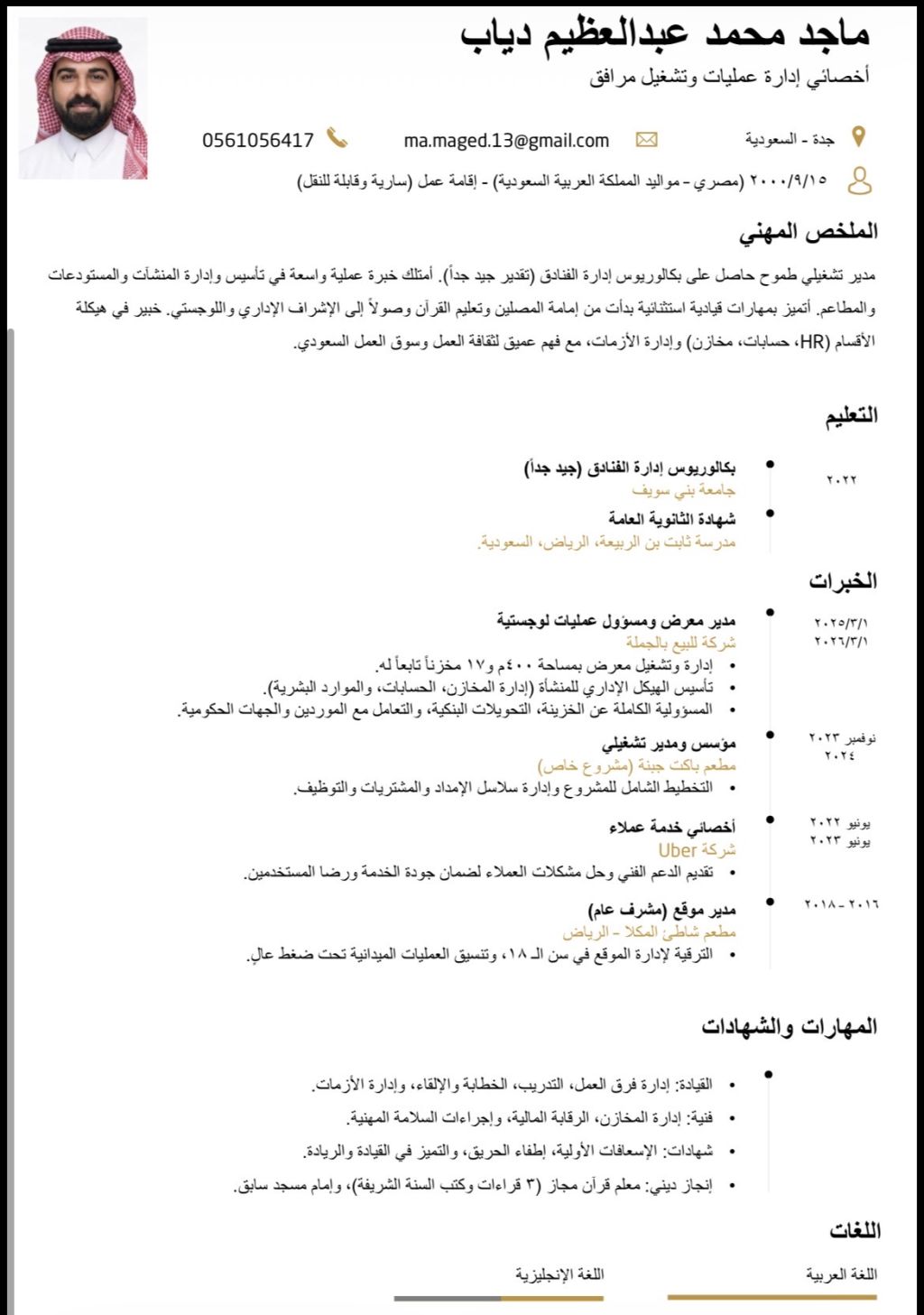أخصائي إدارة عمليات وتشغيل مرافق امتلك خبرة عملية واسعة في تأسيس وإدارة المنشاءات والمستودعات والمطاعم أتميز بمهارات قيادية استثنائية بدأت من إمامة المصلين وتعليم القرآن وصولا الى الاشراف الاداري واللوجستي وإدارة الازمات، مع فهم عميق لثقافة العمل وسوق العمل السعودي