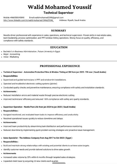 مدير تشغيل وفنيين، ابحث عن وظيفة أخرى. حاصل على ماجستير في ادارة الأعمال'خبرة 3 سنوات لدى شركة نستله بيور لايف وشركة 3M الأمريكية