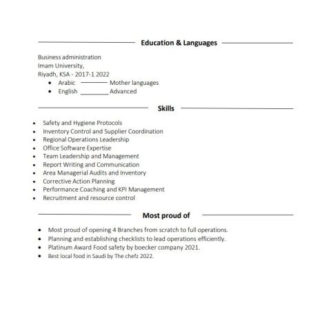 Resident in Riyadh, more than 12 years experience in operate branch or several branches of coffee shops, and operating kids Entertaining center include (restaurant, coffee, playground, and party halls) good skills in consumption and production control, customer service, team training, inventory, purchasing, and all excel reports