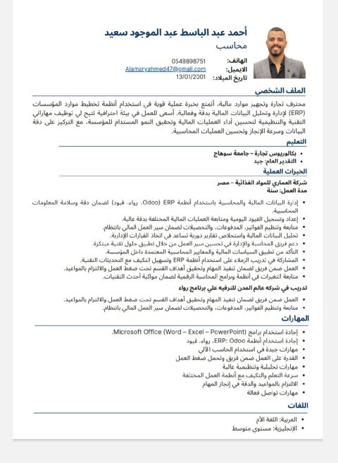 محاسب مصري حاصل على بكالوريوس تجارة - شعبة محاسبة (دفعة 2024) بخبرة عملية أكثر من سنة في المحاسبة العامة. لدي خبرة في تسجيل القيود اليومية، متابعة الحسابات، اعداد التقارير المالية، والجرد والمخزون. أجيد استخدام برامج المحاسبة وExcel، وأتميز بالدقة والتنظيم والالتزام. متاح للعمل فورا داخل الرياض أو أي مدينة أخرى