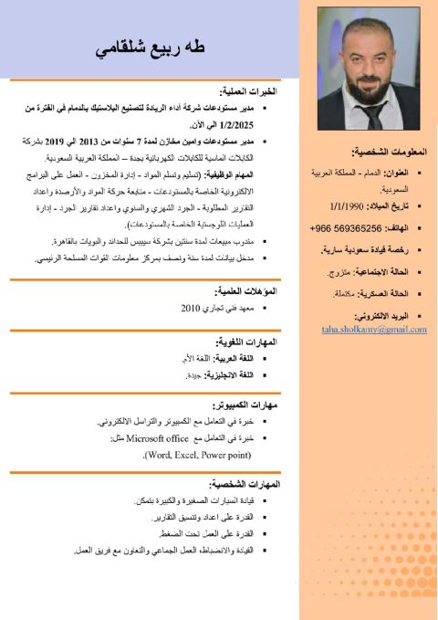 I am Mohammed Nasser, a Lebanese national currently residing in Dammam, Saudi Arabia. I have 12 years of experience in warehouse management, 15 years in factory management as an administrative manager, and 8 years as a showroom and sales manager in the UAE and Lebanon. I also have extensive experience in communication skills, customer service, business organization, and management. I am ready to work
