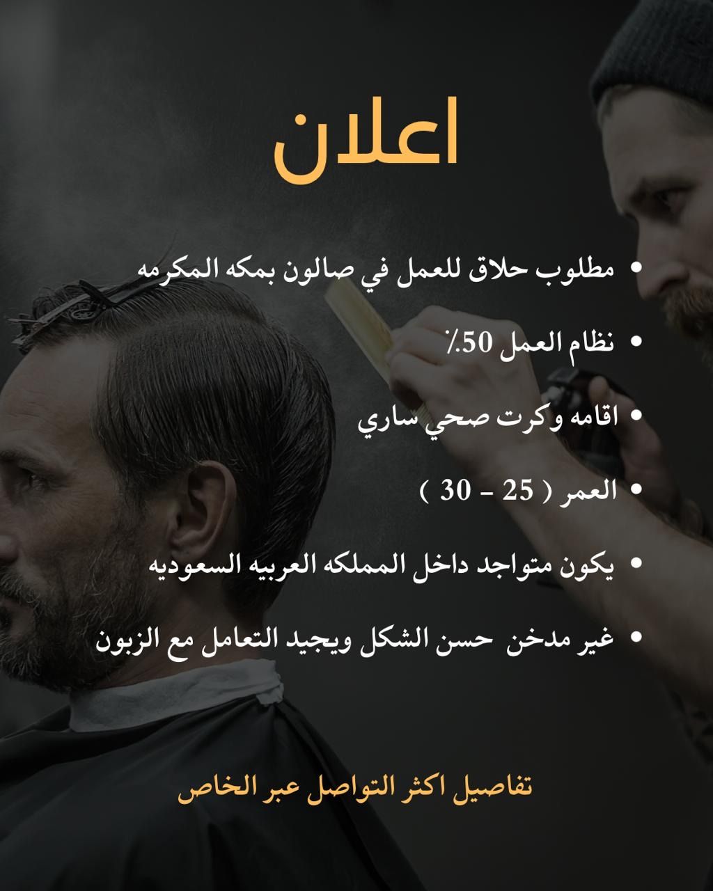 مطلوب حلاق للعمل بصالون حلاقة (رجالي) في مكة المكرمة - الجموم - حي العزيزية - حلاق بروفشنال العمر (20 - 35) من داخل المملكة العربية السعودية، الشكل يكون مرتب ولديه فن التعامل مع الزبون، الشغل نظام 50 للتفاصيل التواصل عبر