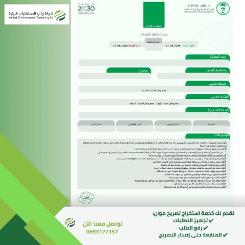 Fast Response Quality Execution Approved by all government agencies We offer a comprehensive, accredited service that includes Renewal of small permits Issuance of port licenses Environmental impact assessments Setting up e government services Direct communication with the National Center for Environmental Control Wathab Environmental Consulting Company is classified as Categor