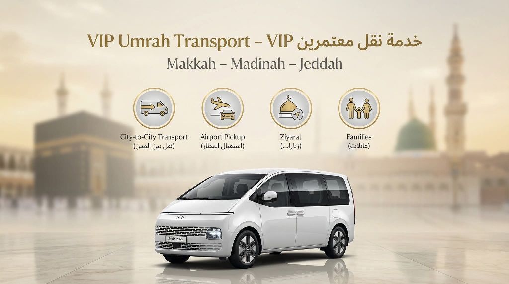 خدمة نقل معتمرين VIP هيونداي H1 / أستاريا 2025 من مكة - المدينة - جدة لو بتدور على راحة وأمان في سفرك بين مكة والمدينة وجدة، أحنا جاهزين نخدمك ب أسطول سيارات هيونداي أستاريا 2025 - 8 راكب بأعلى معايير الراحة. خدماتنا نقل معتمرين بين مكة المدينة نقل من المدينة جدة جولات ومزارات في مكة والمدينة استقبال وتوديع من المطارات سائقين محترفين - التزام بالمواعيد أسعار ممتازة متاح حجوزات