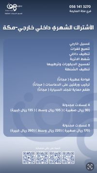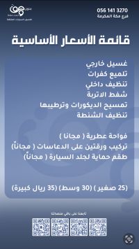 الأسعار شاملة غسيل شامبو واكس. تجفيف مناشف مايكروفايبر. تنظيف الأرضية الداخلية بالمكنسة. تنظيف وتمسيح كامل الداخلية. مواد مخصص للديكور الداخلي. غسيل الجنوط وتلميع الكفرات. هدية اضافة فواحة لتعطير هدية اضافة حماية للجلد هدية اضافة ورقتين أرضية (أفضل جودة وأفخم سعر 19.75 ريال) التواصل والحجز الرقم
