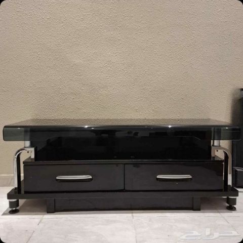 طاولة تلفزيون أنيقة وعصرية بلون أسود لامع مع سطح زجاجي فيها درجين رف مفتوح للاجهزة رسيفر / بلايستيشن / ديكودر) الارجل معدن متين، والطاولة ثابتة وقوية نظيفة واستخدام بسيط بدون أي كسور تناسب جميع الديكورات وتضيف لمسة فخامة للمكان. سعر 200 تواصل موقع مكة الشوقية