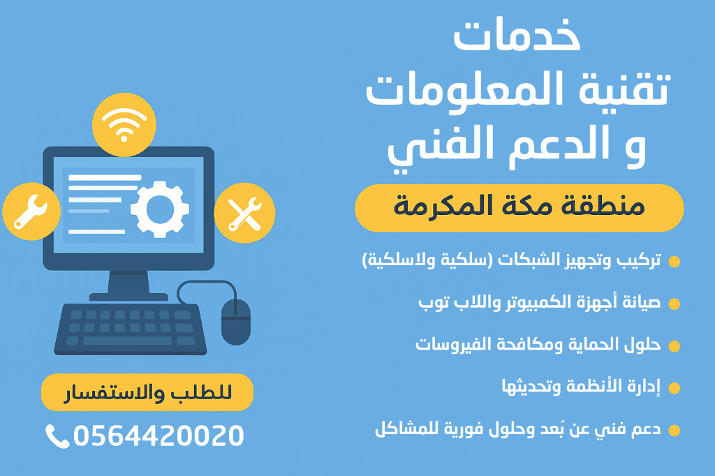 We offer comprehensive IT services with high quality and competitive prices, along with continuous technical support tailored to the needs of companies, institutions, and individuals in the Mecca region. Installation and setup of wired & wireless networks Computer and laptop maintenance Server setup and backup solutions Security and antivirus protection System management and updates Remote technical