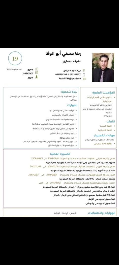 مشرف معماري خبرة أكثر من 10 سنوات داخل المملكة العربية السعودية وابحث عن عمل والله ولي التوفيق