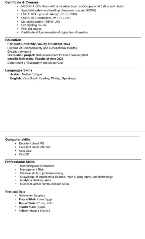 Dedicated and qualified Safety Officer with 3 years of experience in construction safety, holding NEBOSH, IOSH, and OSHA certifications. Seeking an opportunity to contribute my skills and ensure workplace safety and compliance