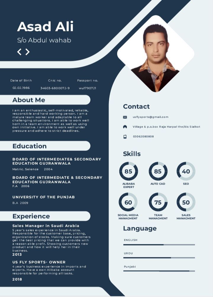 I am Asad Ali. I have done graduation with many course. like AutoCAD safety course Osha. Know English also have driving lacince. know work sells things on computer