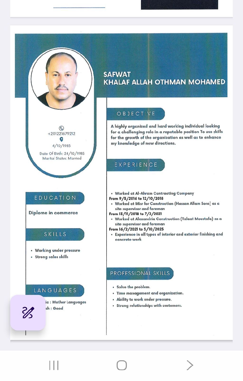 مشرف عمال خبرة في جميع أنواع المقاولات والمعمار والتشطيبات وفي مجال الأمن والسلامة وادارة الأعمال 41 عام إقامة سارية متواجد في الرياض