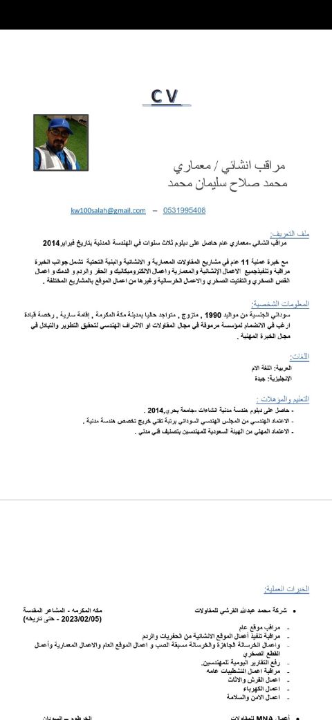مراقب انشائي معماري خبرة 11 عام خبرة داخل المملكة 3 سنوات تصنيف من المجلس الهندسي السوداني والمجلس الهندسي السعودي بي فني هندسة مدنيه خبرة في الأعمال الانشائية لي جميع أعمال الهيكل الخرساني للمباني وكذلك الاعمل الانشائية لي الهناجر والمباني المعدنية. وخبرة بأعمال التشطيبات الداخلية والخارجية وأعمال الواجهات الزجاجيه والكلا دن والكار تنول وأعمال الكهربائية والميكانيكية