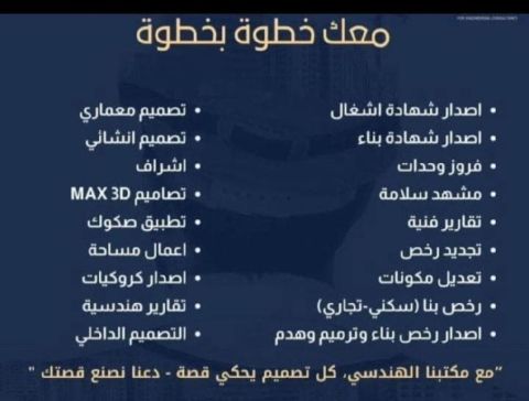 مكتب للاستشارات الهندسيه / اصدار جميع رخص البناء فلل عمارات سور ملحق محلات تجارية - اصدار رخص تصيح وضع - تجديد رخصة بناء - اصدار رخصة هدم وترميم - فرز وحدات عقارية - فرز وتقسيم أراضي من صك الى صكين وأكثر حسب المساحة - شهادة أشغال اضافة عددات - كروكى تنظيمي كروكى احكام - تحديث وتعديل صكوك رفع مساحي وتوقيع احدثيات. استمرار الدعم السكني
