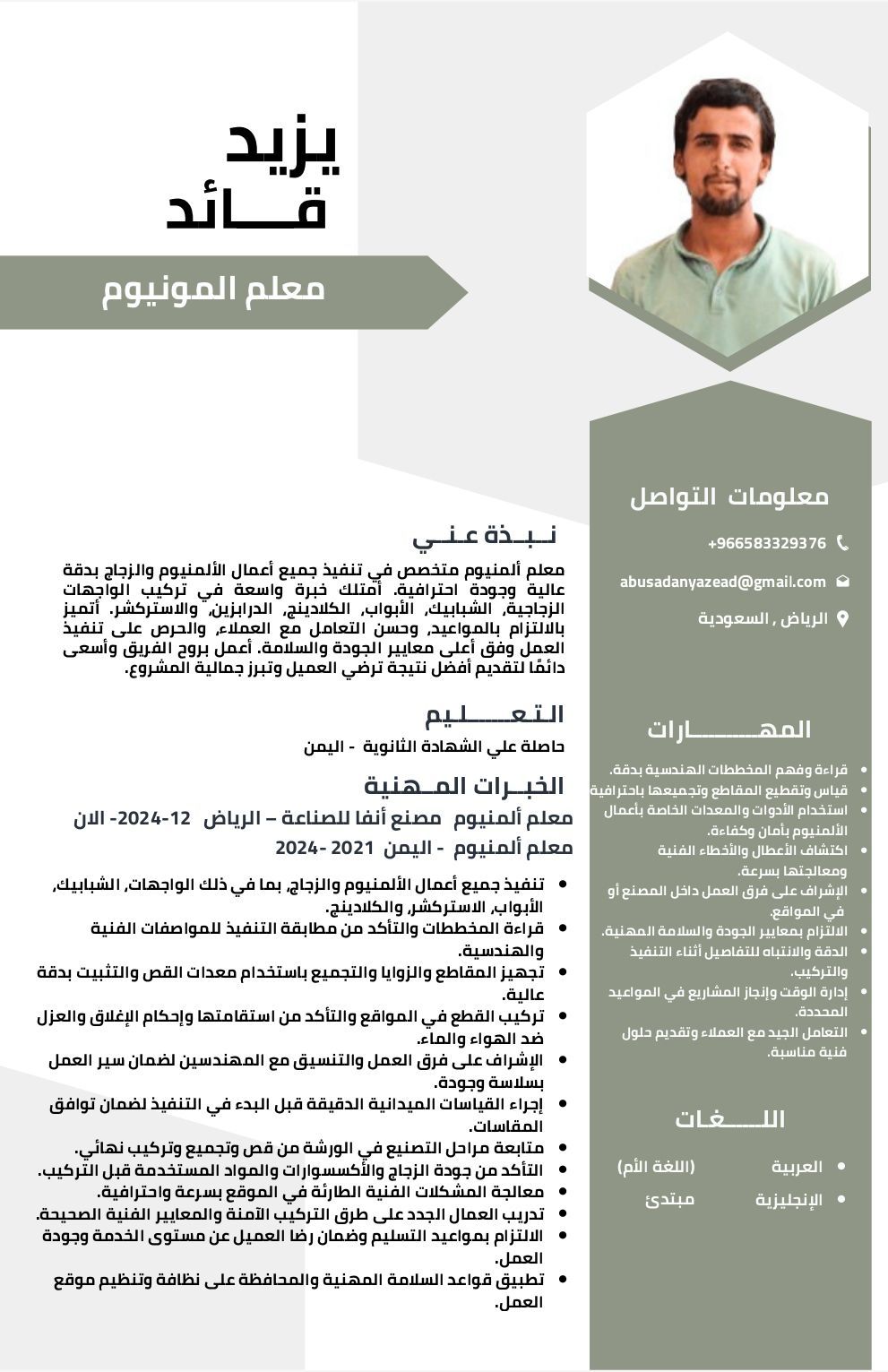 أنا معلم ألومينيوم ابحث عن عمل لدي خبرة تتجاوز 4 سنوات في تنفيذ جميع أعمال الألومينيوم والزجاج. عملت سابقا في اليمن لمدة 3 سنوات، وحاليا اعمل في مصنع أنفا للصناعة في الرياض منذ ديسمبر 2024م حتى الآن. أتقن تنفيذ وتركيب الواجهات الزجاجية، الشبابيك، الأبواب، الاستركشر، والكلادينج، مع الالتزام بالجودة والدقة في العمل